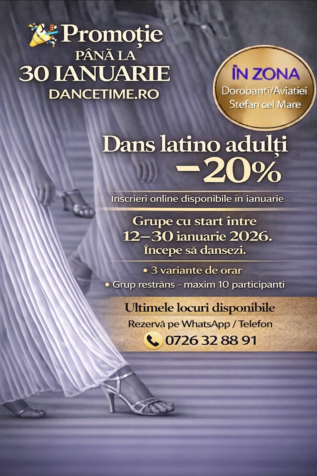 Imbina si tu utilul cu placutul, relaxarea cu armonia si tonusul muscular cu distractia. Cursuri de dans sportiv (*latino si de societate) relaxante cu 10 adulti/curs incep la Scoala de Dans DAnce Time! Inca stai pe scaun?… mai mult