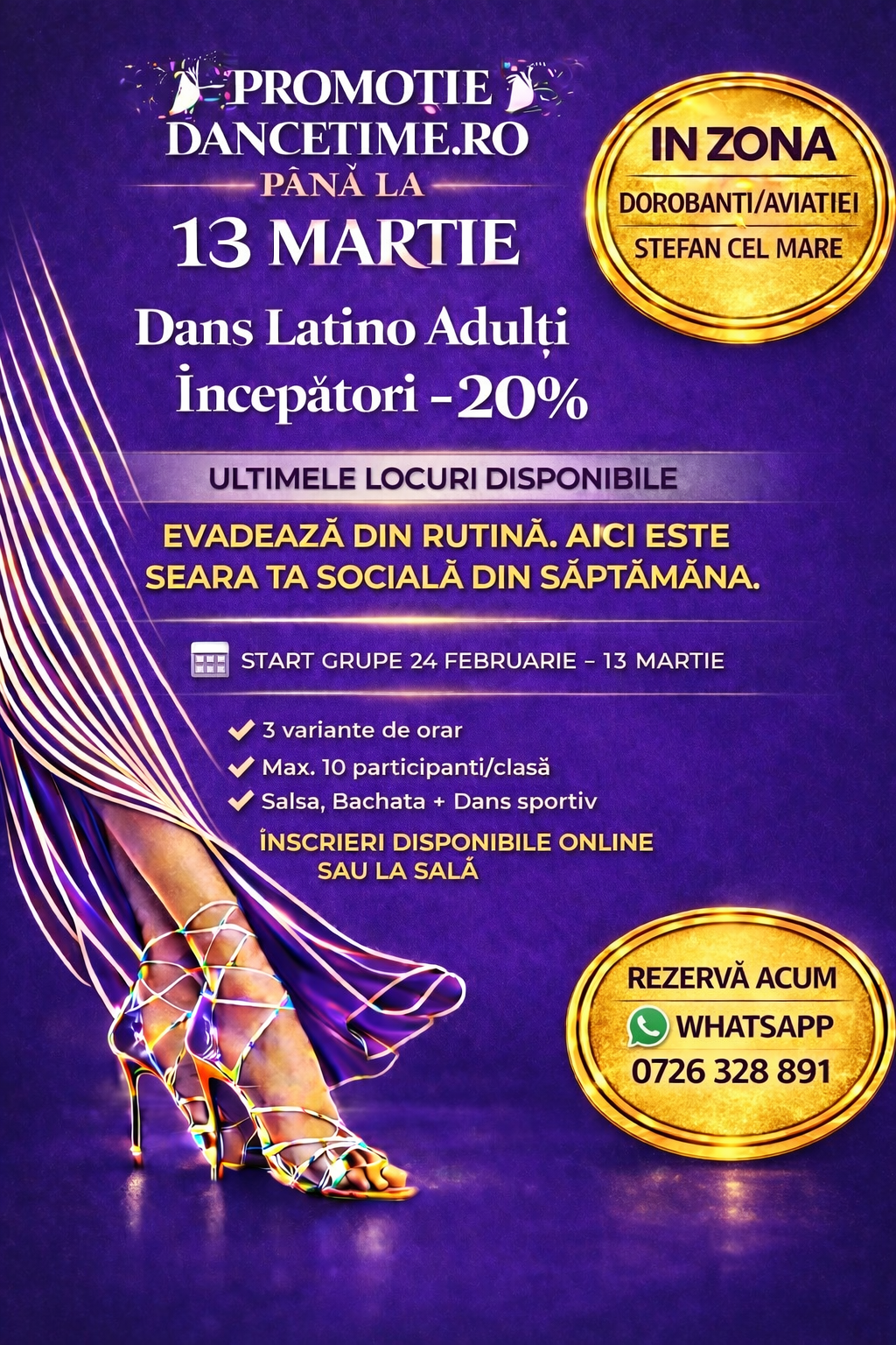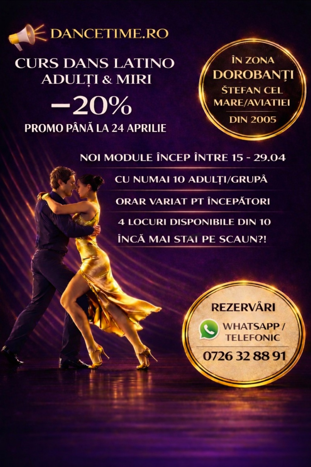 DAnce Time este una din primele scoli de dans sportiv si Salsa, Bachata din Bucuresti, Romania. Am infiintat scoala de dans in anul 2005 si avem peste 20 ani de experienta in predarea dansului, plus 15 ani de dans de performanta. Instructorii sunt multiplii campioni si fosti dansatori profesionisti. Te initiem in peste 30 de stiluri de dansuri latino (Salsa, Bachata, Merengue, Tango Argentinian …) sau de dans sportiv sau dansul mirilor sau dansuri populare sau dansuri moderne pentru nunta. Garantia calitatii: la scoala noastra inveti in grupe de numai 10 persoane, in sali de dans excelente, fara praf, fara inghesuiala. mai mult