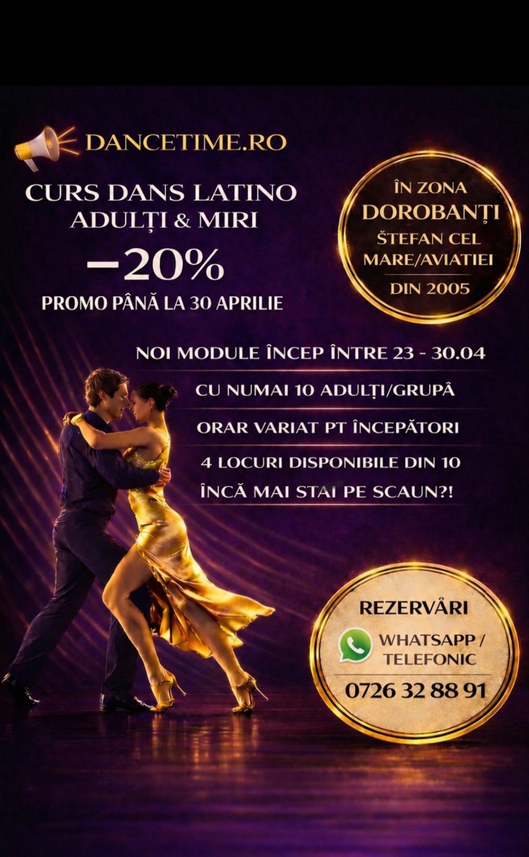 DAnce Time Bucuresti organizeaza din anul 2005 cursuri de dans, miscare si relaxare pentru adulti si copii. Pe baza unei metode de predare fast learning alaturi de noi descoperi placerea dansului si poti dezvolta 6 tipuri de inteligente emotionale. Instructorii DanceTime- fosti dansatori profesionisti- iti arata sistemic, organizat, toti pasii de dans sportiv din clasele valorice ale Federatiei Romane de Dans sportiv + Salsa, Tango Argentinian, Bachata, Kizomba, Samba, Rock`n`roll, Vals vienez pentru nunta ta, dansuri populare si dans modern. Participi si nu mai stai pe scaun la evenimente. Cursurile se tin in Bucuresti, sector 1-2. Join us! Contact aici – click.