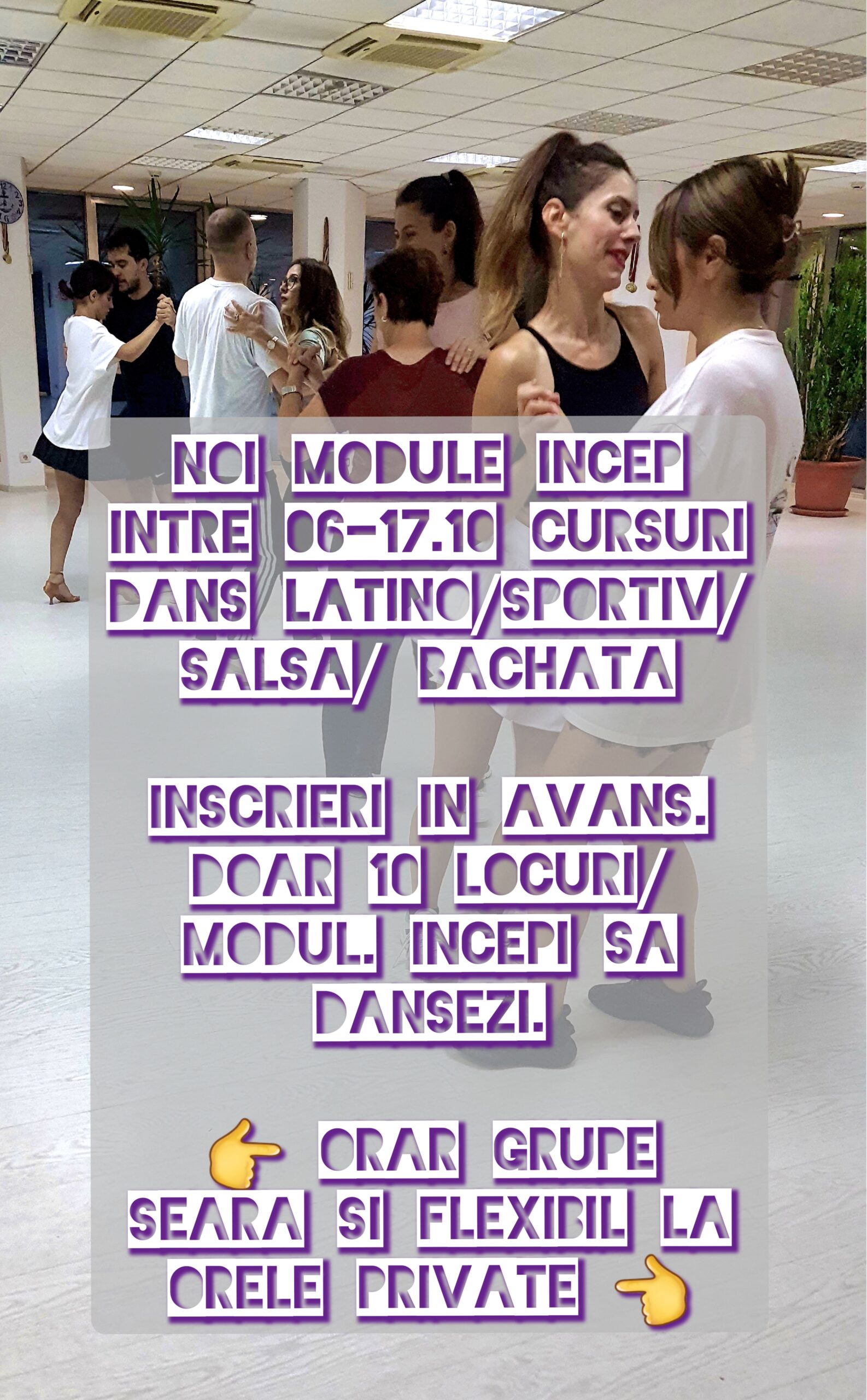 Grupa 10 – curs de dans incepatori – orar vineri de la 19:45 si sâmbătă de la 12:30. Informatii si rezervari telefonice.